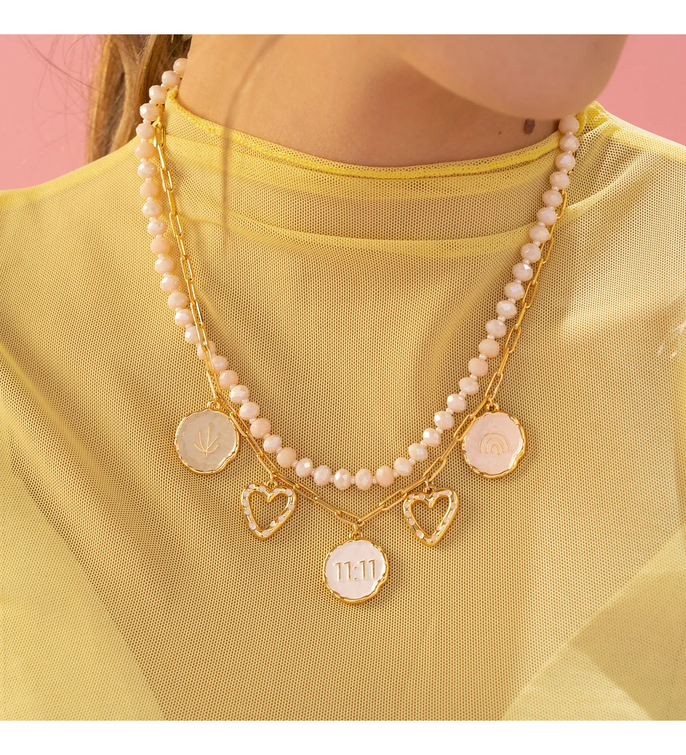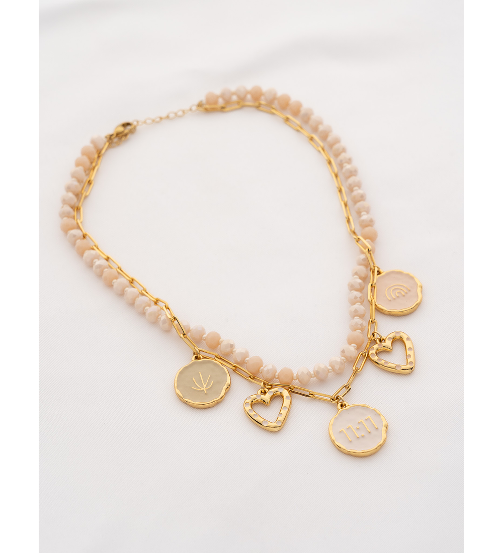 - Collar en bronce con baño de oro de 24k y dijes del collar en Zamak (aleación de metales) con baño de oro de 24k.