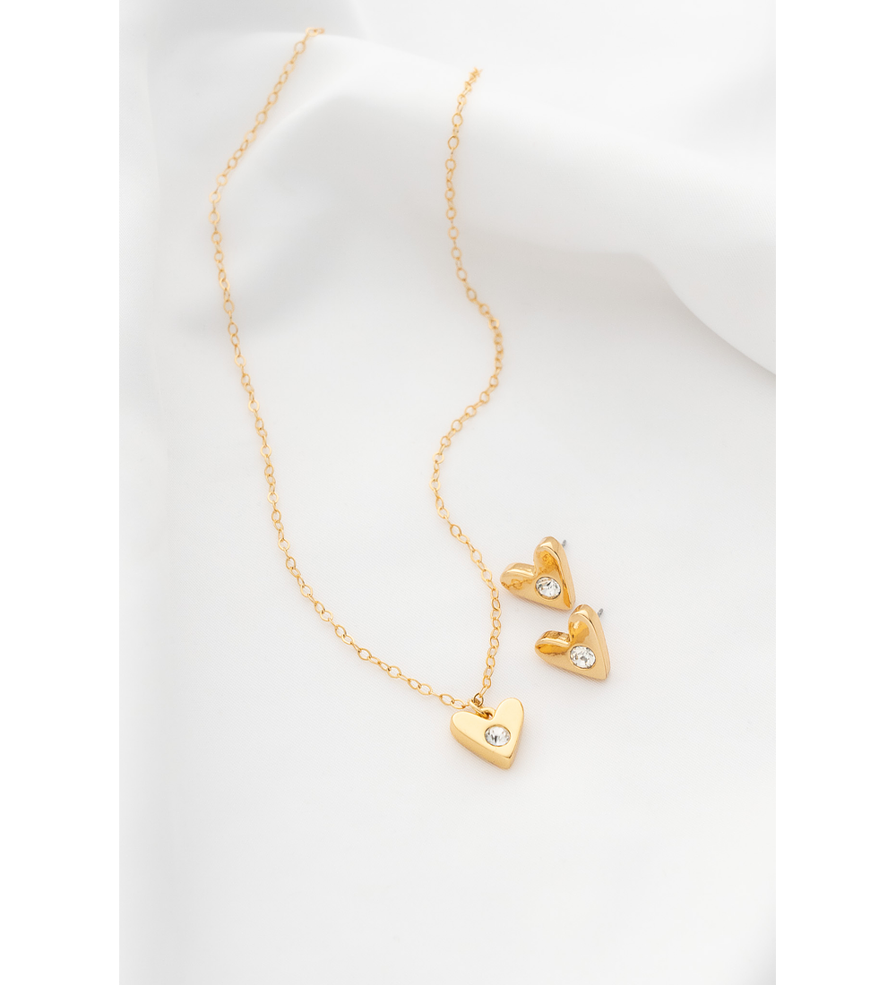 - Incluye: 1 collar + 1 par de aros corazón zamak con cristal incrustado.